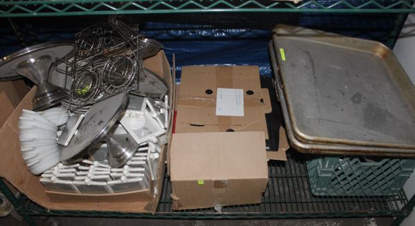 LOWER SHELF LOT OF GLASSES, PANS, MENU HOLDERS,ETC