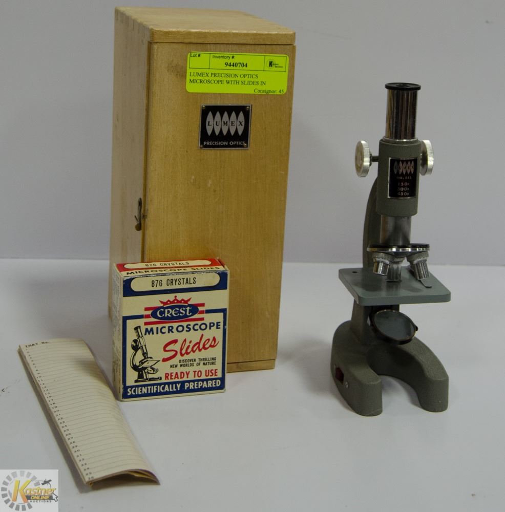 LUMEX PRECISION OPTICS MICROSCOPE WITH SLIDES IN