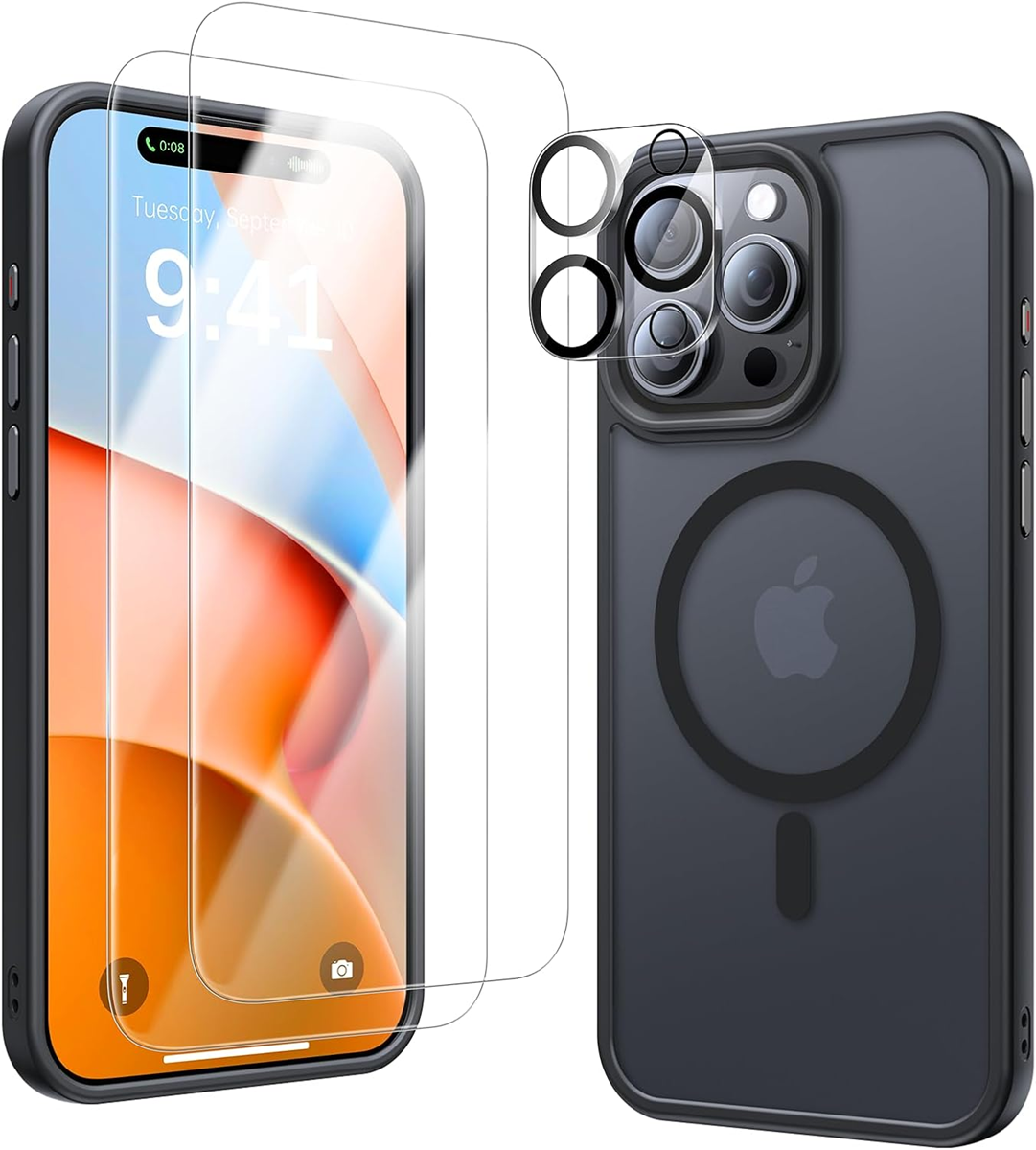 MAGNETIC FOR IPHONE 15 PRO MAX CASE (4 IN 1) SET WITH 9H TEMPERED GLASS SCREEN PROTECTOR AND CAMERA LENS PROTECTOR. SHOCKPROOF MATTE FOR IPHONE 15 PRO MAX CASE, BLACK