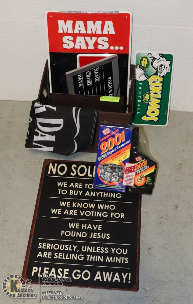 WRESTLING BELT, JACK DANIELS FLAG, VINTAGE OIL LUBRICANT SET, EDMONTON ESKIMOS LICENSE PLATE, FOREST GUMP CHALKBOARD AND PLATE & METAL SIGNS