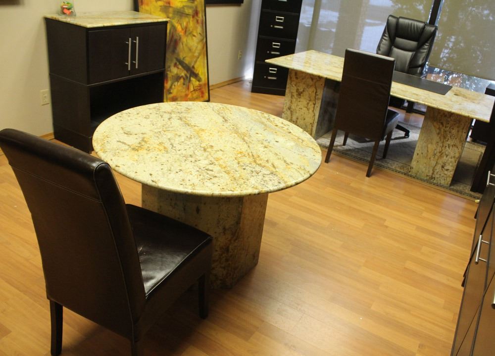 MARBLE OFFICE DESK, TABLE AND CABINET W/ 3 CHAIRS