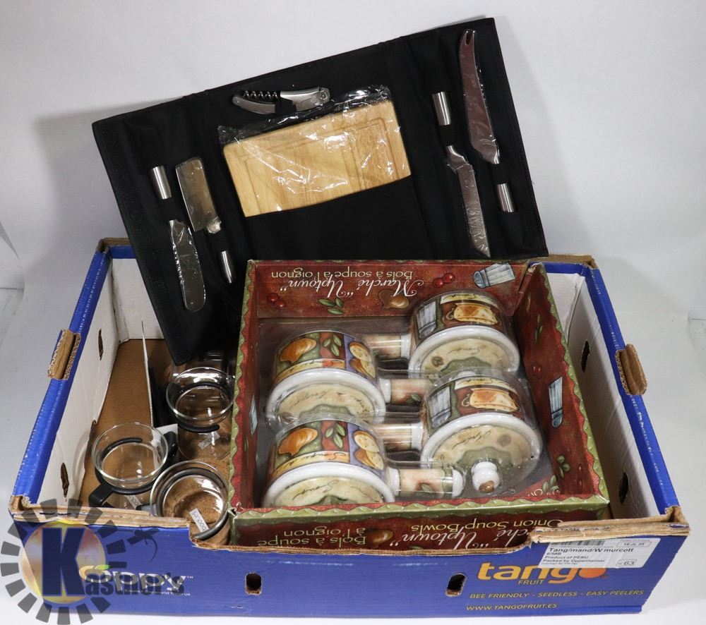 WITH PIZZA & SUB CUTTING BOARD & ACCESSORIES AND 4 CUP BISTRO SET OF COFFEE CUPS AND COASTERS. HOME/