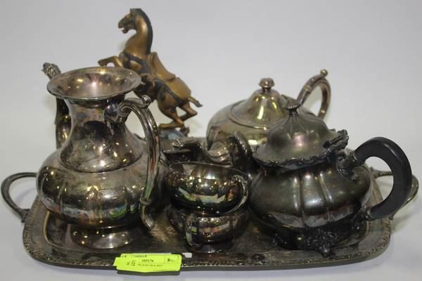INCLUDES TRAY, 2 POTS, CREAMER & SUGAR DISH, 2 CANDLE HOLDERS & BRASS HORSE FIGURINE