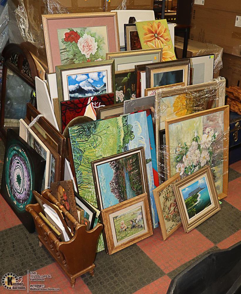 MASSIVE LOT OF ASSORTED FRAMED PICTURES WITH STAND