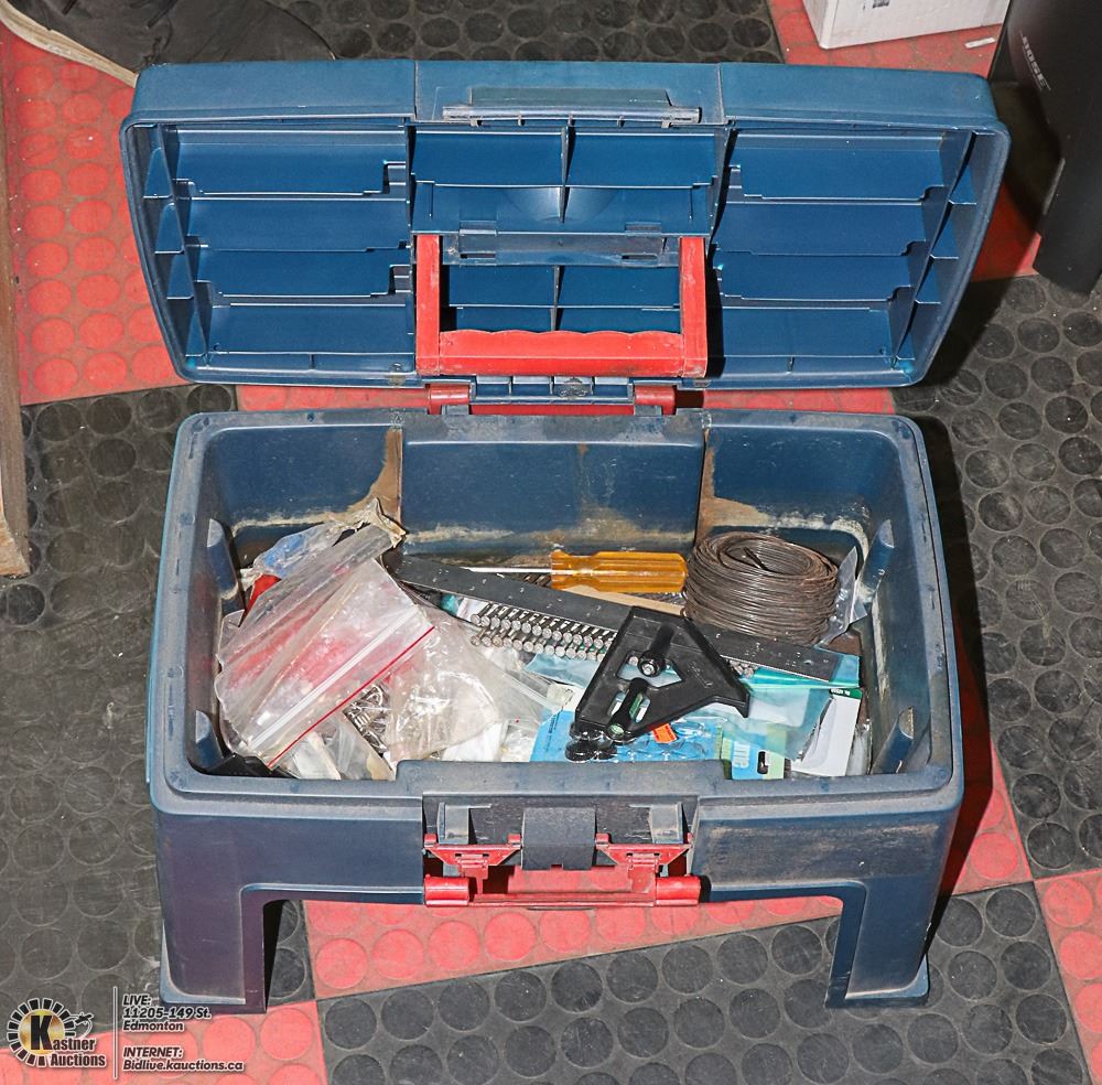 BENCH/STEP CLAMP-DOWN LID - FULL OF NEW HARDWARE AND SOME TOOLS (20"L X 12.5"W X 13"H) - TOOLS