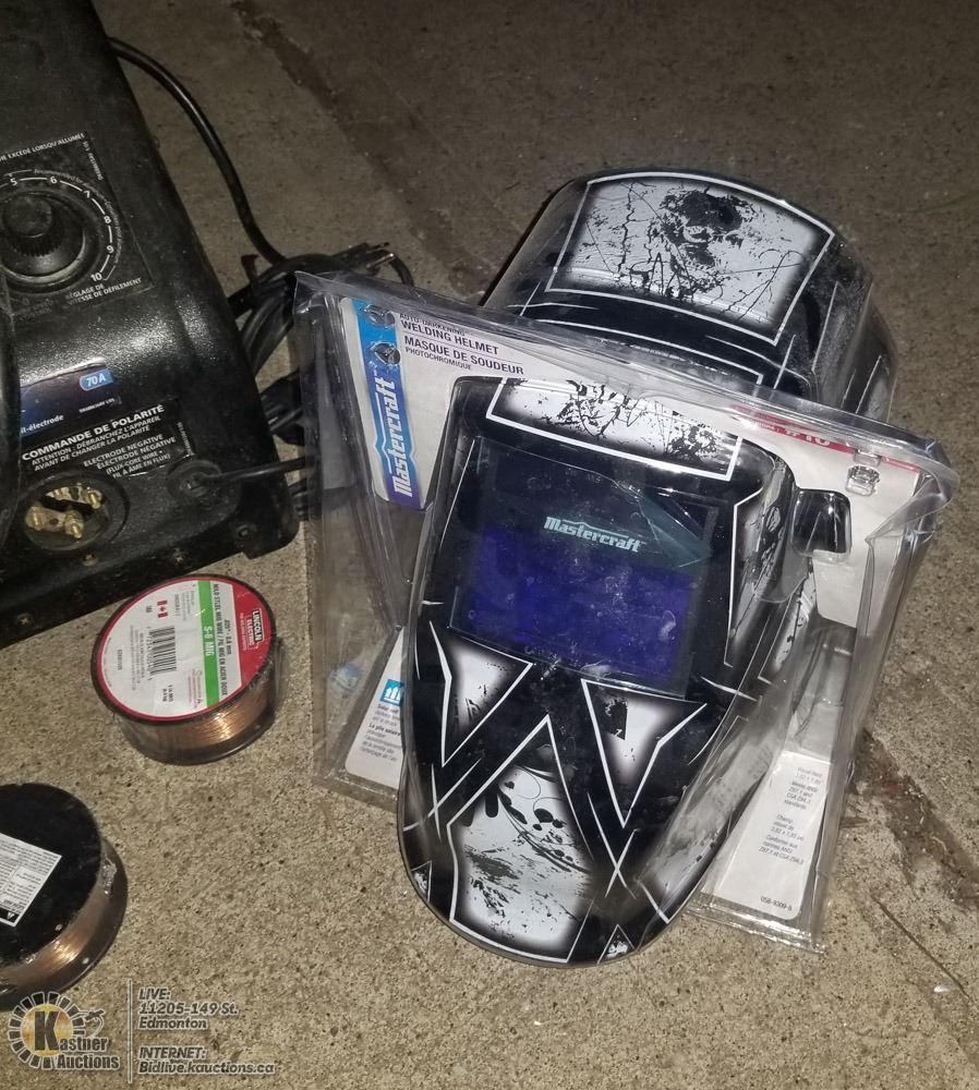 WELDING HELMET, NEW IN BOX AND 2 NEW ROLLS OF 0.25 LINCOLN MIG WIRE.(MINI'S) . TOOLS
