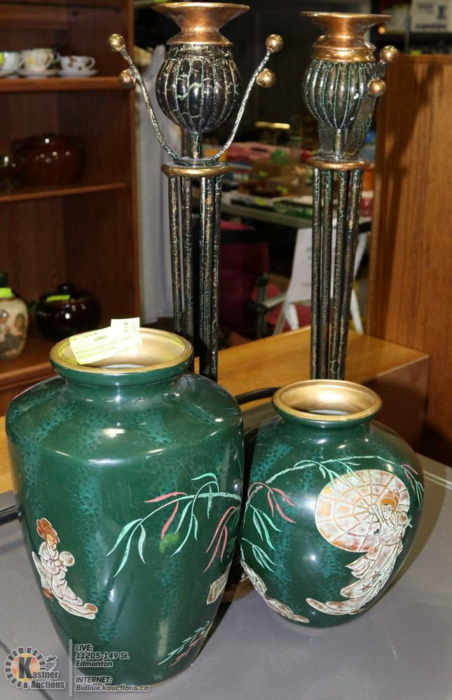 MATCHING 2 GREEN TONE VASES AND CANDLE HOLDERS