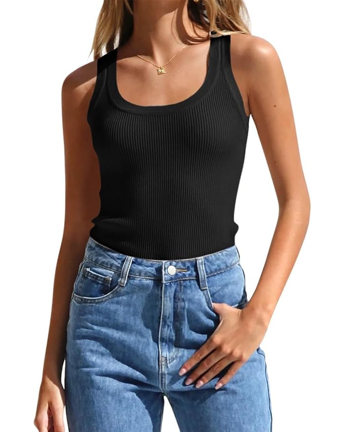MATERASU WOMEN RIBBED TANK TOPS KNIT SQUARE NECK SLEEVELESS SHIRTS SUMMER CASUAL BASIC TANKS | Category: Clothing/Shoes