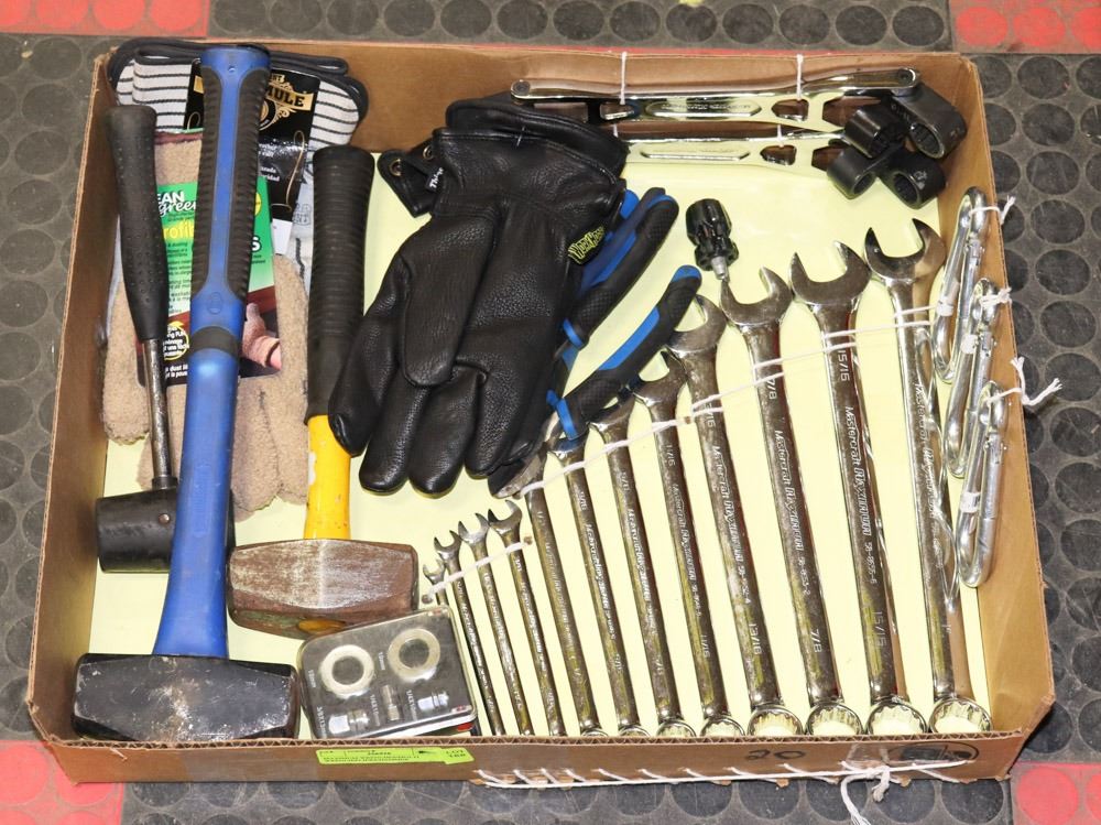 12 MAXIMUM SAE WRENCHES, 2 MAXIMUM "MULTI-WRENCHES", 2 MASTERCRAFT SLIP-JOINT PLIERS, MASTERCRAFT SIDE CUTTERS, SET METRIC FINGER WRENCHES, RUBBER MALLET, 2 SLEDGE HAMMERS, 3 QUICK HOOKS, 1 PR COWHIDE LEATHER WORK GLOVES,1 PRDEERSKIN BLACK GLOVES