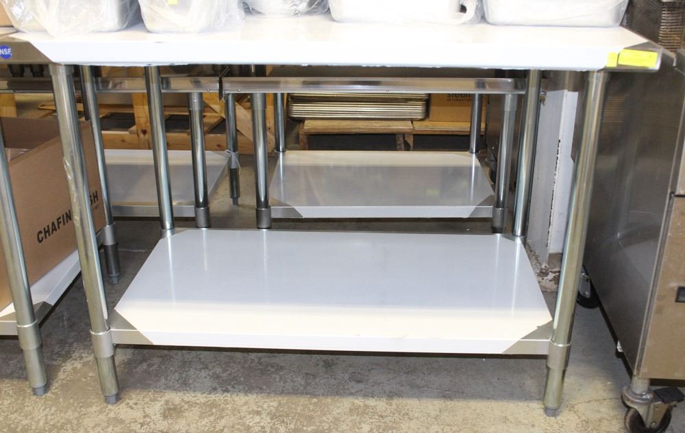 4" BACK SPLASH, GALVANIZED LEGS & UNDER SHELF. RESTAURANT EQUIPMENT.