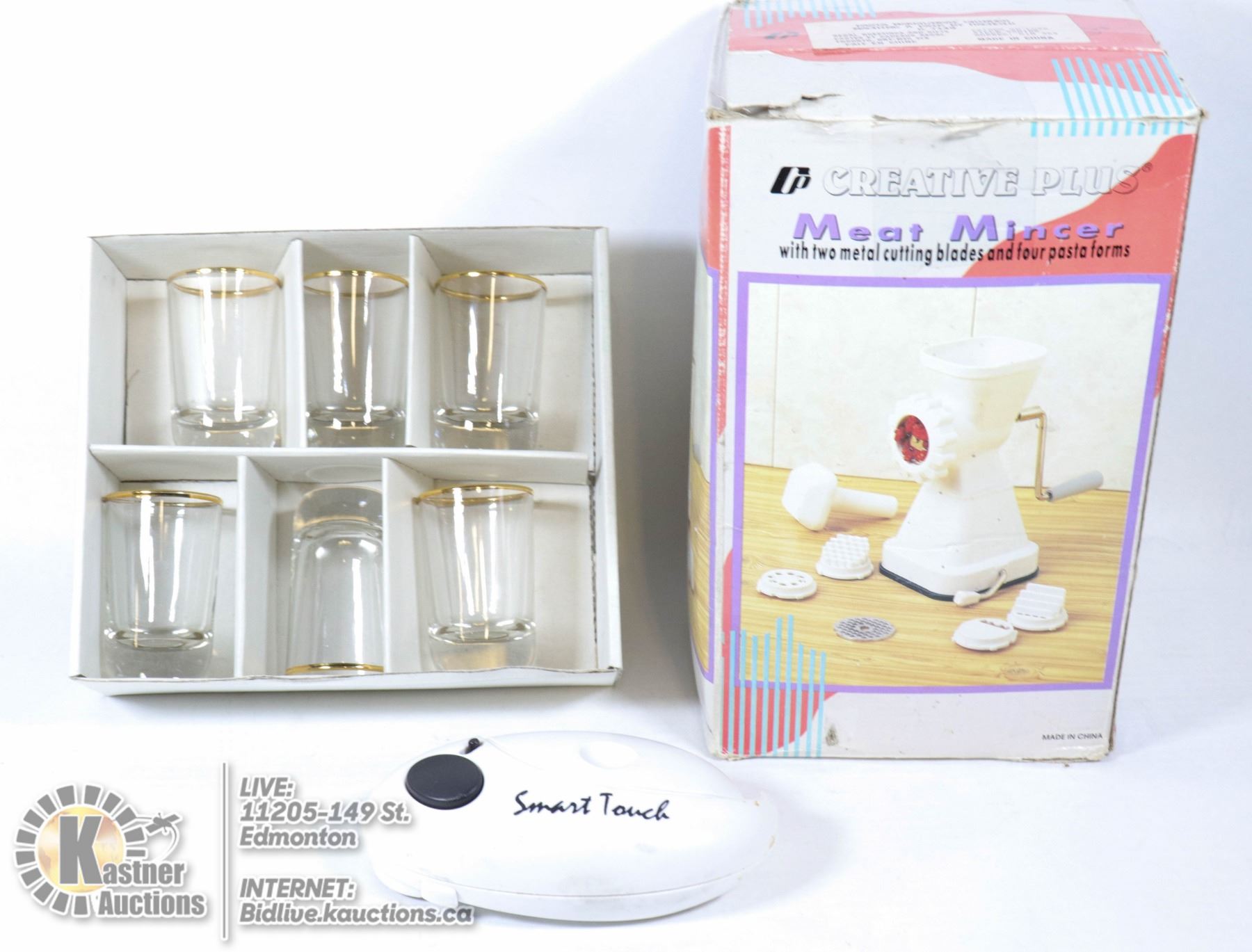 MEAT MINCER/ CAN OPENER/ 6 SHOOTER GLASSESS
