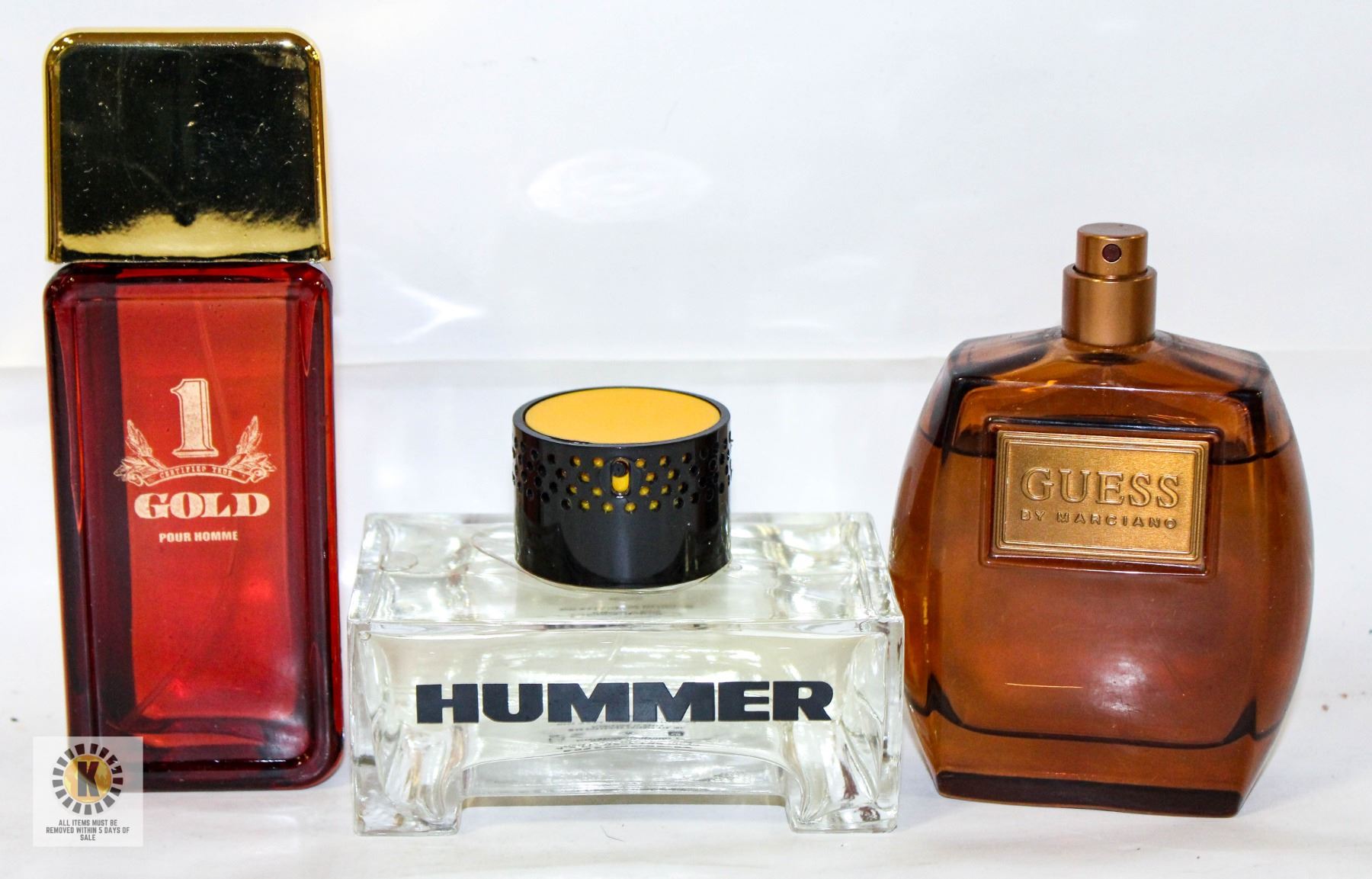 SPRAY GOLD #1 100ML (UNUSED), HUMMER 125 ML, GUESS BY MARCIAN 100ML **ALL ITEMS MUST BE REMOVED BY 5PM SATURDAY, MARCH 29TH 2025. ALL REMAINING ITEMS WILL BE SUBJECT TO A $6.00 PER DAY STORAGE CHARGE. ANY ITEMS REMAINING AFTER MONDAY, APRIL 21ST 2025 WILL BE CONSIDERED FORFEITED. NO REFUNDS WILL BE ISSUED FOR FORFEITED ITEMS. TO SCHEDULE A PICK UP APPOINTMENT CLICK HERE