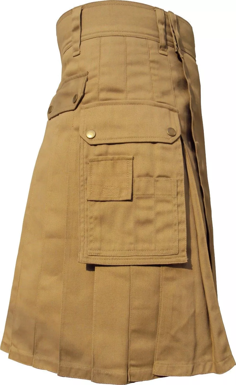 MEN'S SCOTTISH HIGHLAND ACTIVE MODERN POCKET KHAKI LIGHT BROWN KILT 100% COTTON (SIZE-36)