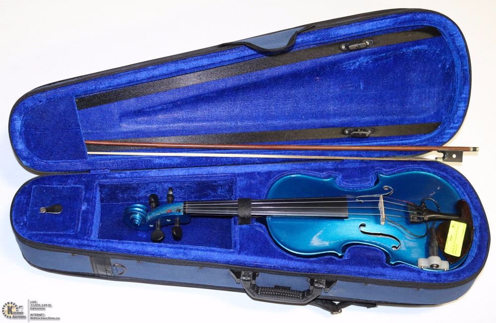 MENZEL BLUE VIOLIN WITH PICK UP BOW & CASE.