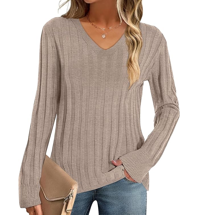 MEROKEETY WOMEN'S 2024 FALL V NECK SWEATER LONG SLEEVE RIBBED KNIT CASUAL SLIM FITTED PULLOVER TOP | Category: Clothing/Shoes