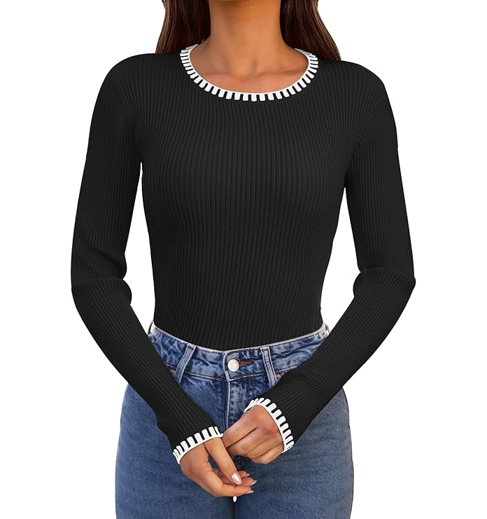 MEROKEETY WOMEN'S 2024 LONG SLEEVE RIBBED COLOR BLOCK SWEATER CREWNECK SLIM FITTED BASIC KNIT T SHIRT TOPS | Category: Clothing/Shoes