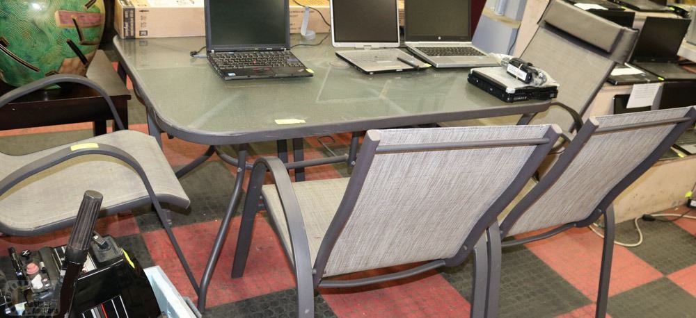 METAL AND GLASS PATIO TABLE WITH 6 CHAIRS