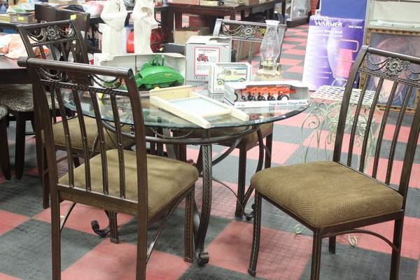 METAL AND GLASS ROUND TABLE W 4 CHAIRS