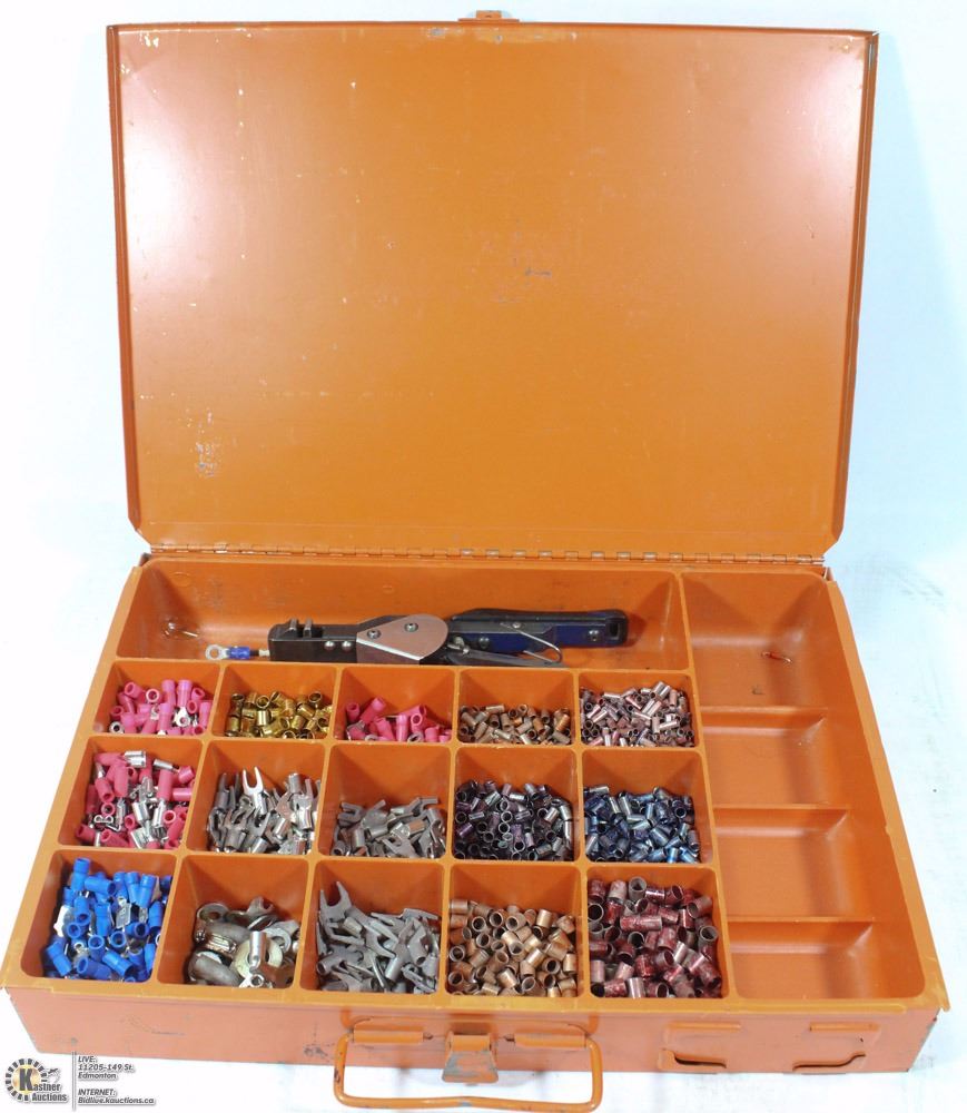 METAL BOX FULL OF LUGS AND CRIMPER TOOL