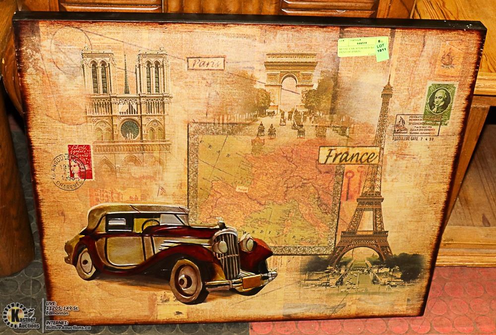 METAL CAR ATTACHED TO A BACK GROUND PICTURE OF (PARIS FRANCE) 23 1/2" X 19 3/4"-ART