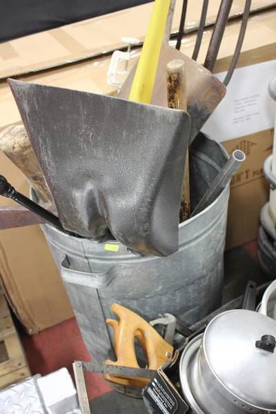 METAL GARBAGE CAN SOLD WITH GARDEN TOOLS