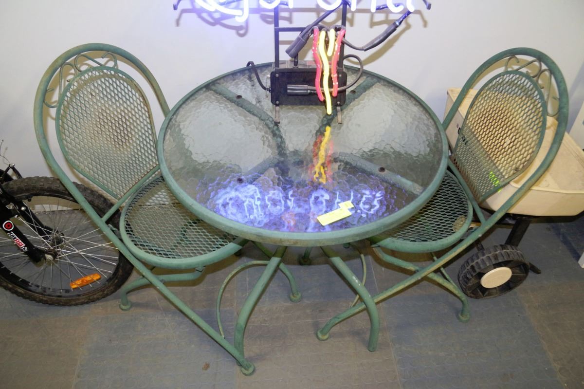 METAL & GLASS PATIO TABLE W/ TWO FOLD AWAY CHAIRS