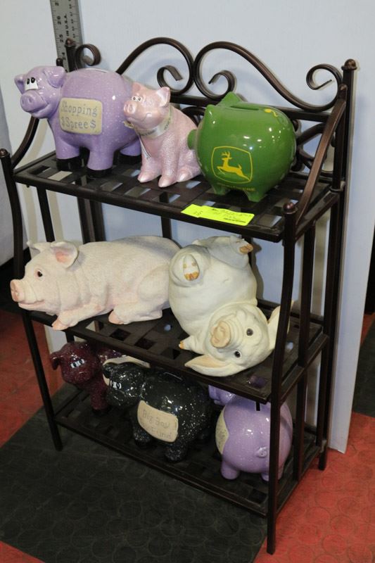 METAL RACK W PIGGY BANKS AND ORNAMENTS