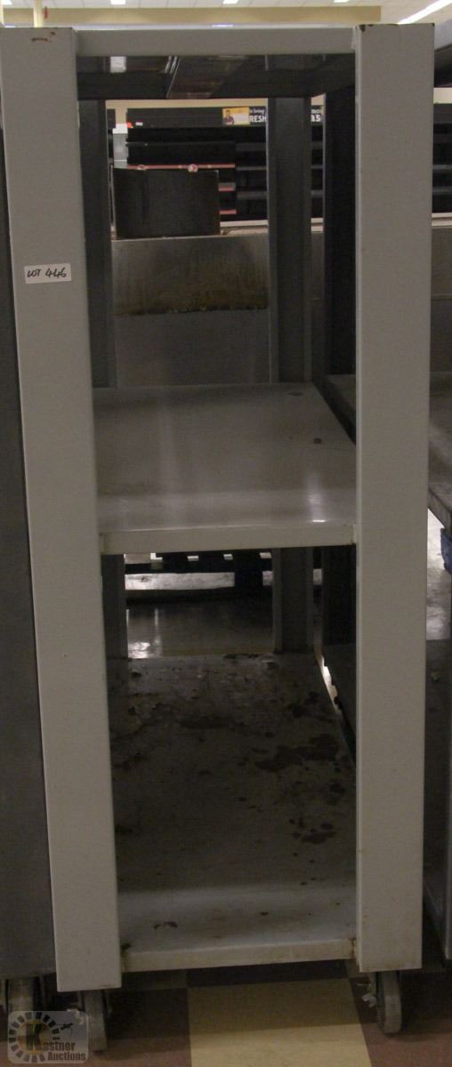 METAL THREE TIER BACKROOM STOCKING SHELF ON CASTOR