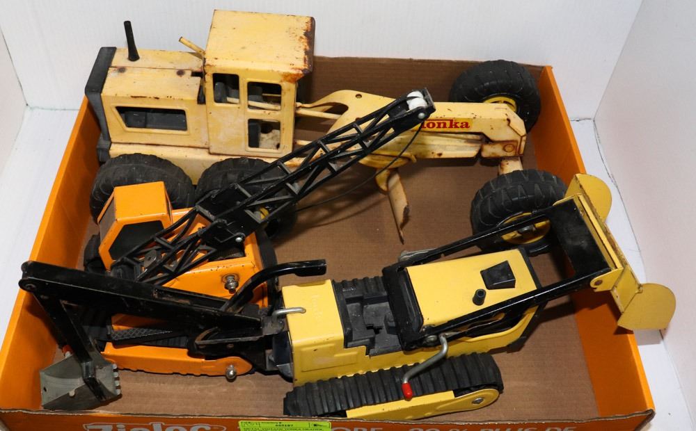 METAL VINTAGE TONKA GRADER, BACK HOE, CRANE