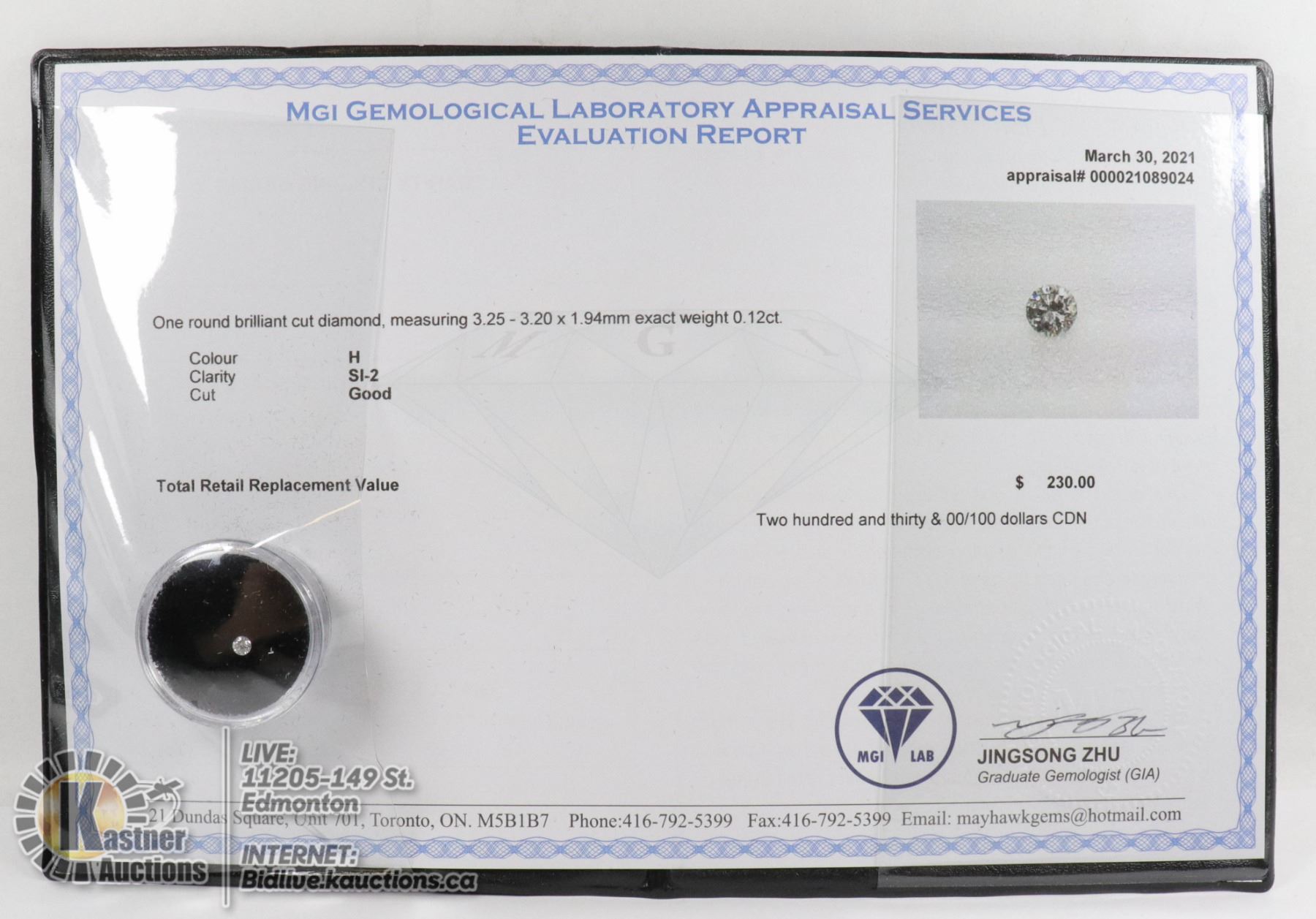 MGI LAB APPRAISED COA GENUINE 0.12ct DIAMOND