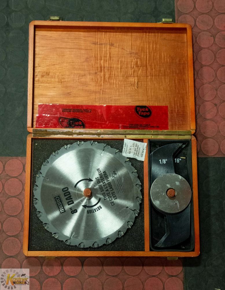 BOX HAS TWO MICROGRAIN CARBIDE TIPPED BLADES, SHIMS, & DADOS