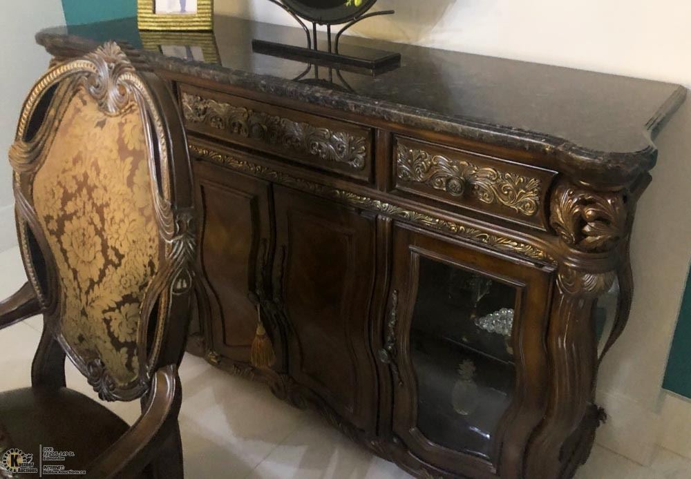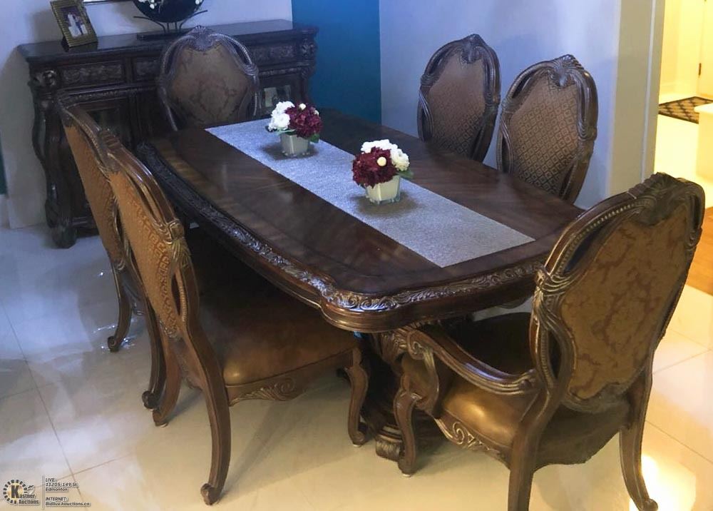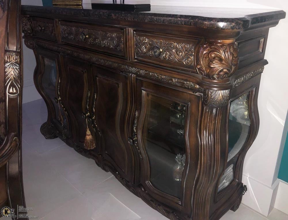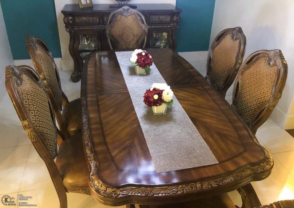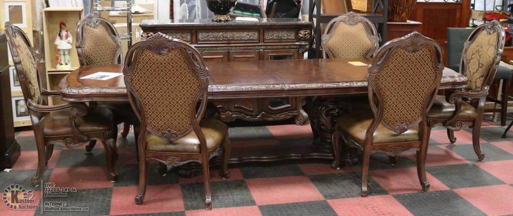 DININGWOOD SET INCL CARVED TABLE WITH 2 LEAFS 6 CHAIRS AND MARBLETOP SIDEBOARD. TABLE MEASURES:122"X44"X31"H, SIDEBOARD MEASURES 19"X67"X42"H. VERY HEAVY, BRING HELP. FURNITURE. OWNER PAID OVER $12000 FOR THE SET!