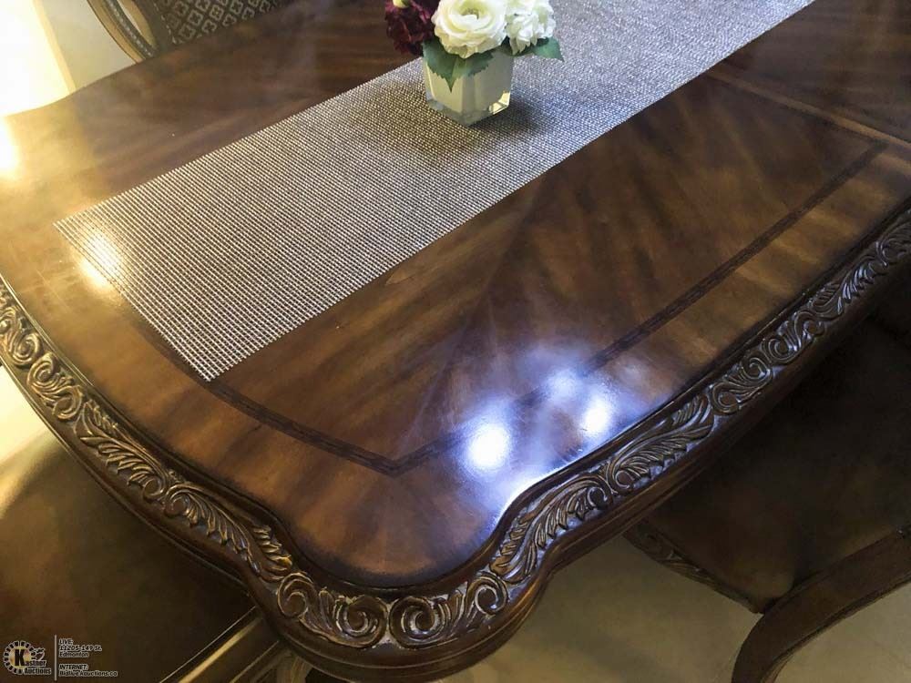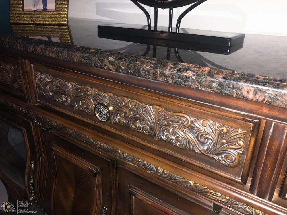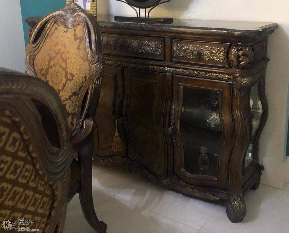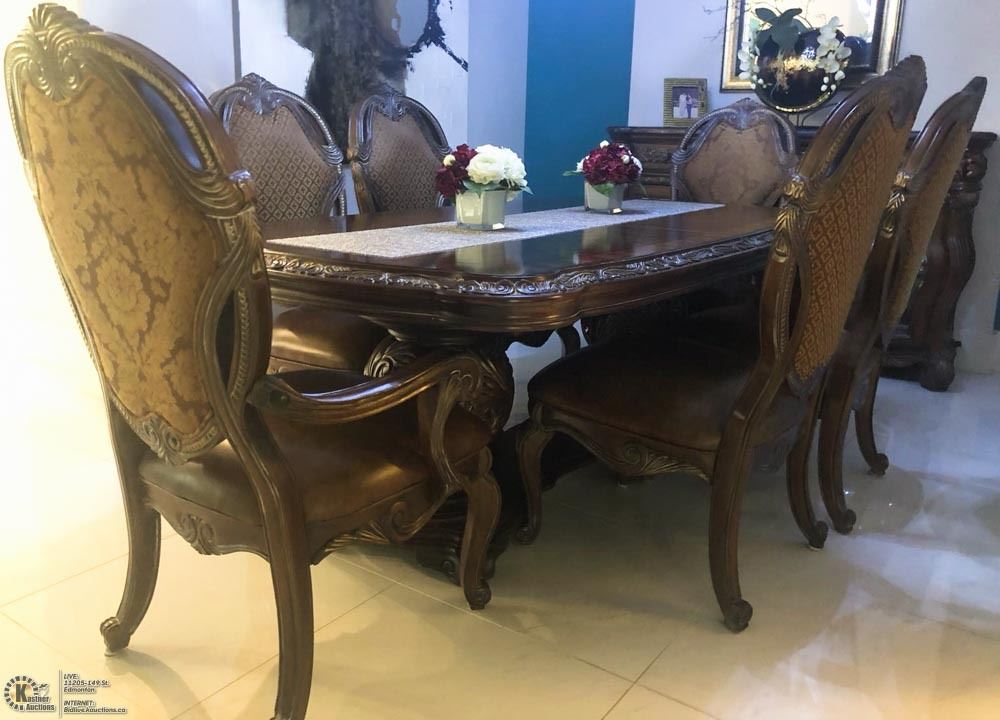 DININGWOOD SET INCL CARVED TABLE WITH 2 LEAFS 6 CHAIRS AND MARBLETOP SIDEBOARD. TABLE MEASURES:122"X44"X31"H, SIDEBOARD MEASURES 19"X67"X42"H. VERY HEAVY, BRING HELP. FURNITURE. OWNER PAID OVER $12000 FOR THE SET!