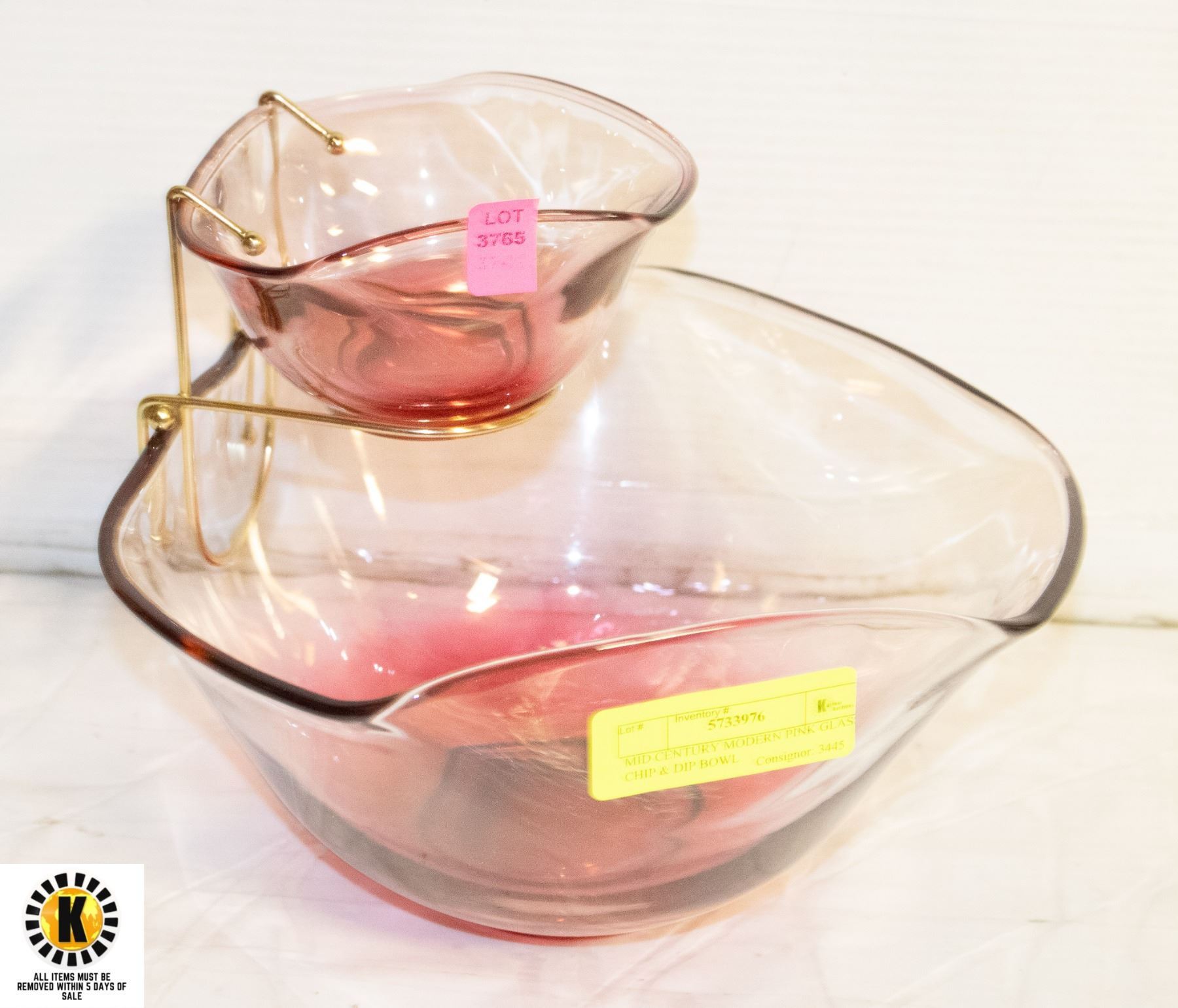 MID CENTURY MODERN PINK GLASS CHIP & DIP BOWL