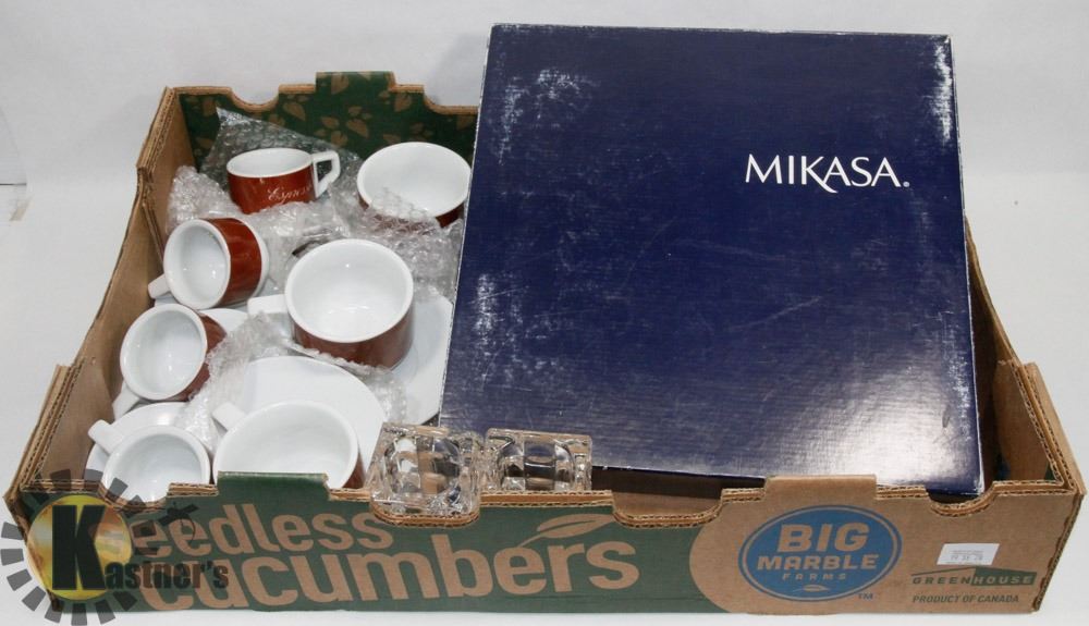 MIKASA GLASS CANDLE HOLDERS, 7 CAPPUCCINO AND ESPRESSO CUP & SAUCERS. HOME