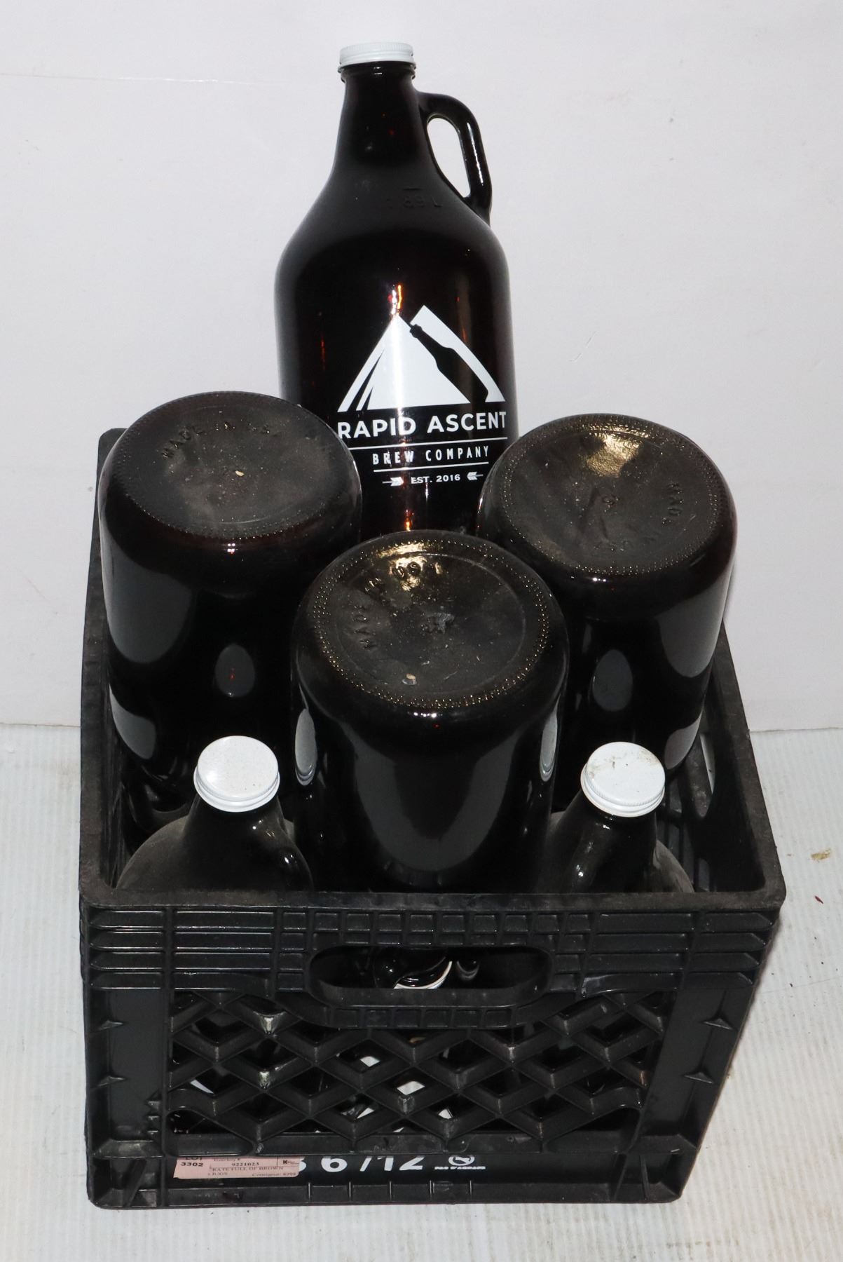 MILK CRATE FULL OF BROWN GLASS JUGS