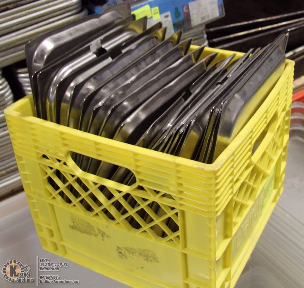 MILK CRATE FULL OF INSERT LIDS OF VARIOUS SIZES