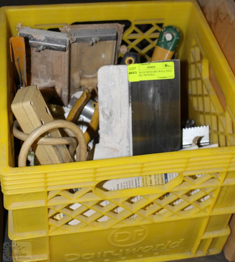 MILK CRATE WITH DRY WALL POLE SANDERS, TROWELS,