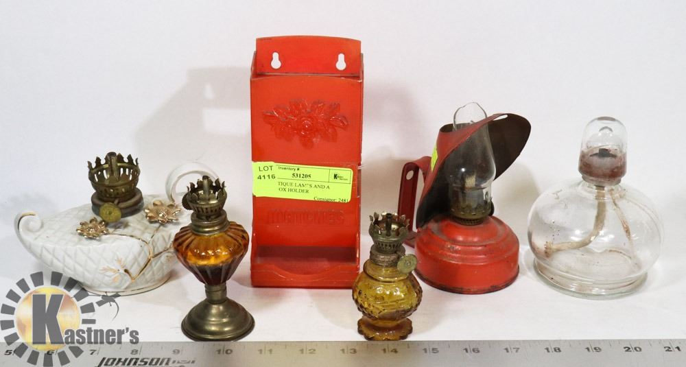 MINI ANTIQUE LAMPS AND A MATCHBOX HOLDER