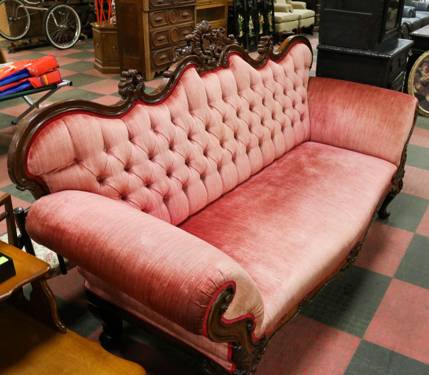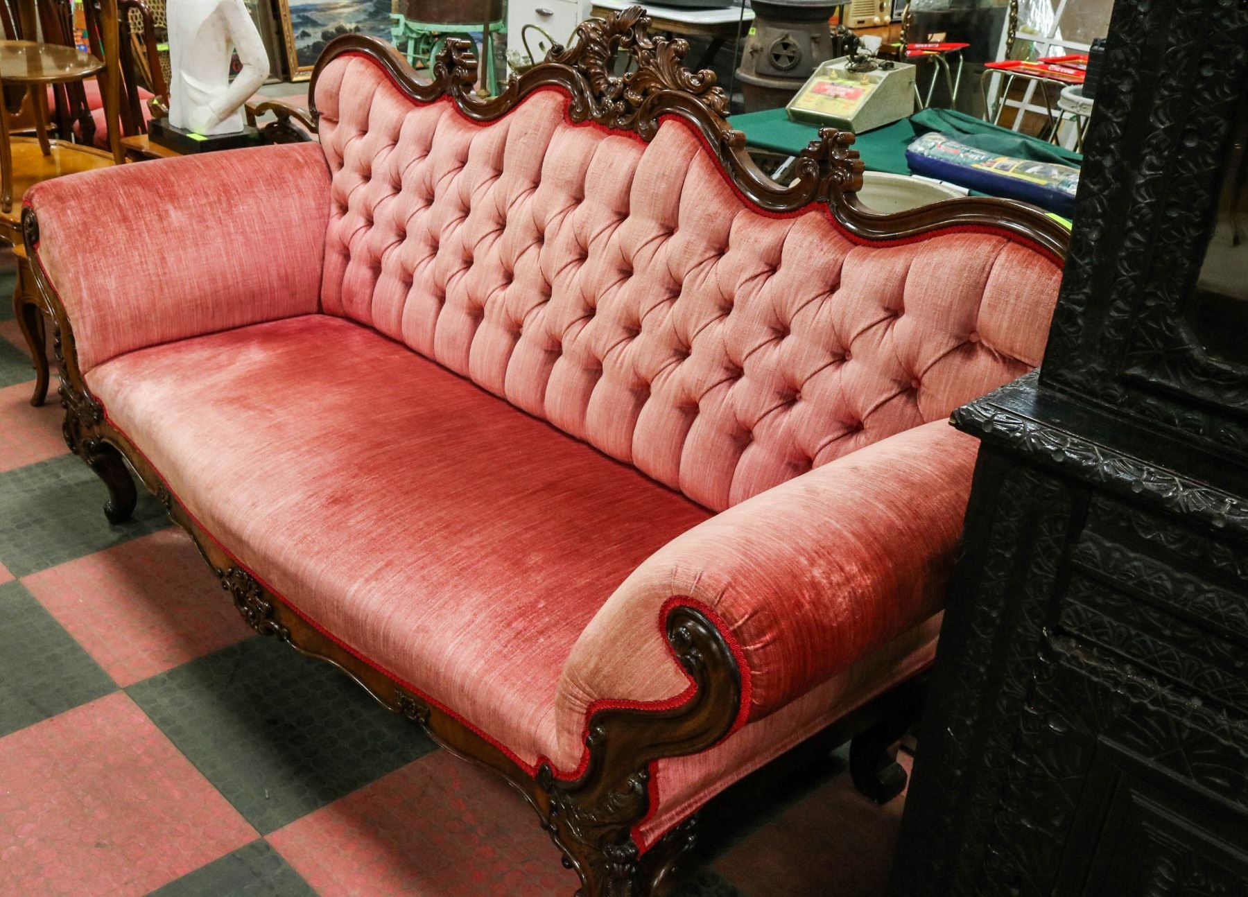 ANTIQUE ROSE VELVET COVERED AND TUFTED BACK (RARE) - 1880S. 45" TALL X 85" WIDE.