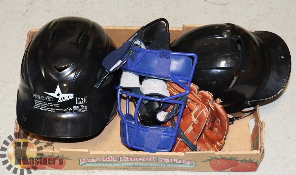 2 CATCHERS MASKS, BATTING HELMETS AND CHILD'S GLOVE
