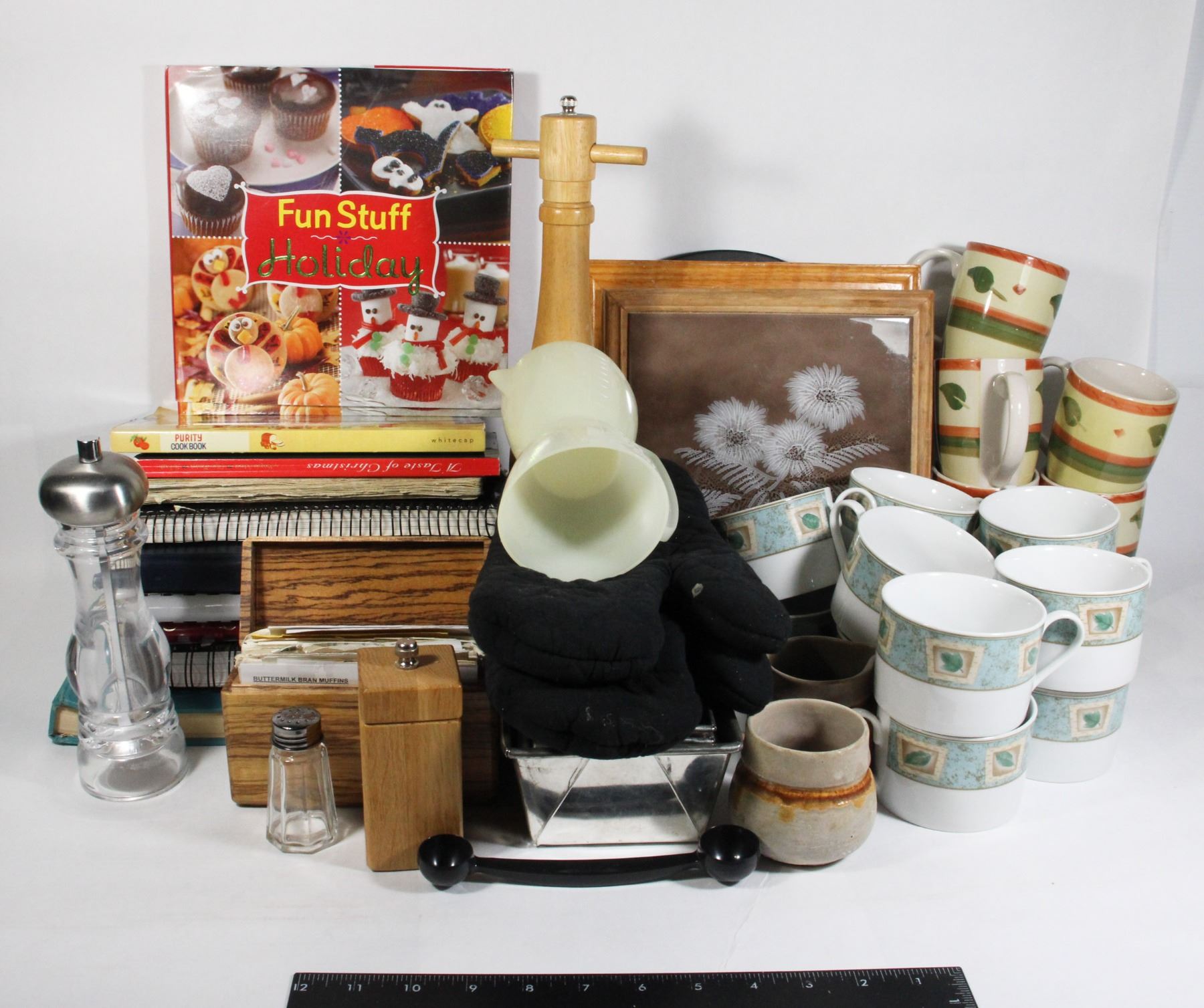 MIXED KITCHEN LOT: COOKBOOKS, SALT PEPPER SHAKERS,