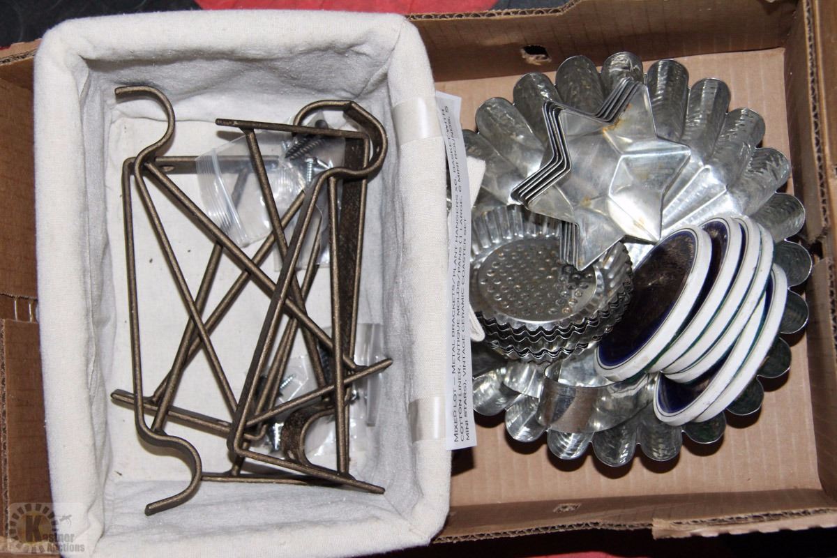 (6QTY) BASKET WITH COTTON LINER,VINTAGE MOLDS/PANS (1LARGE, 6 MINI ROUNDS AND 5 MINI STARS) AND VINTAGE CERAMIC COASTER SET