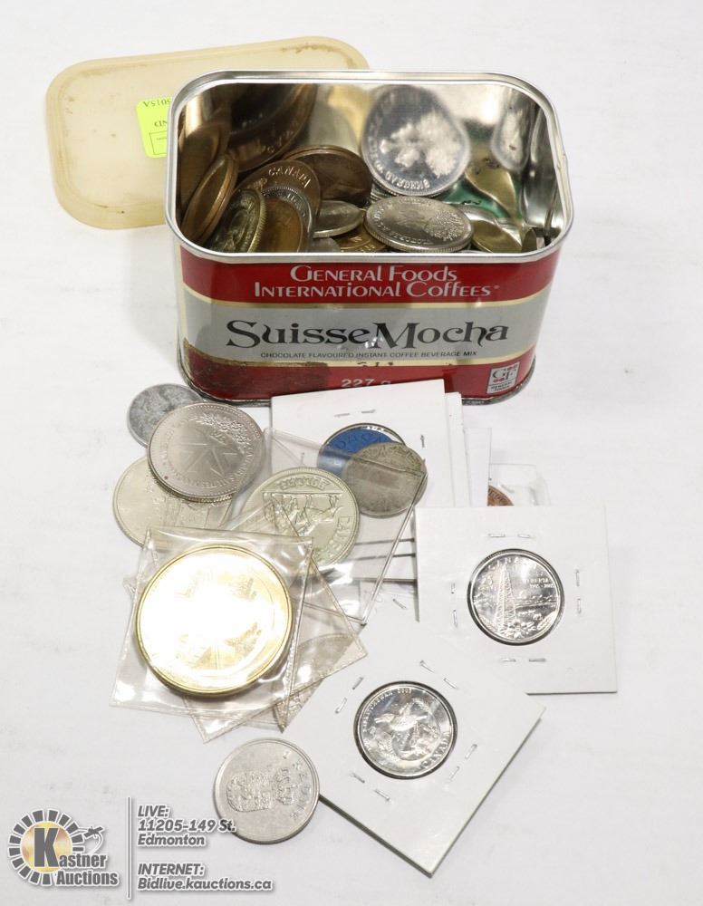 ESTATE LOT OF VARIOUS COINS AND TOKENS FROM CANADA AND AROUND THE WORLD. GOOD MIX. UNSORTED GROUP LOT.