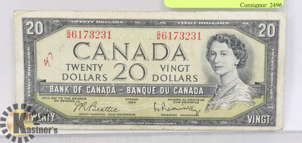 BANK OF CANADA S/N G/W6173231 BEATTY RASMINSKY. COINS AND CURRENCY