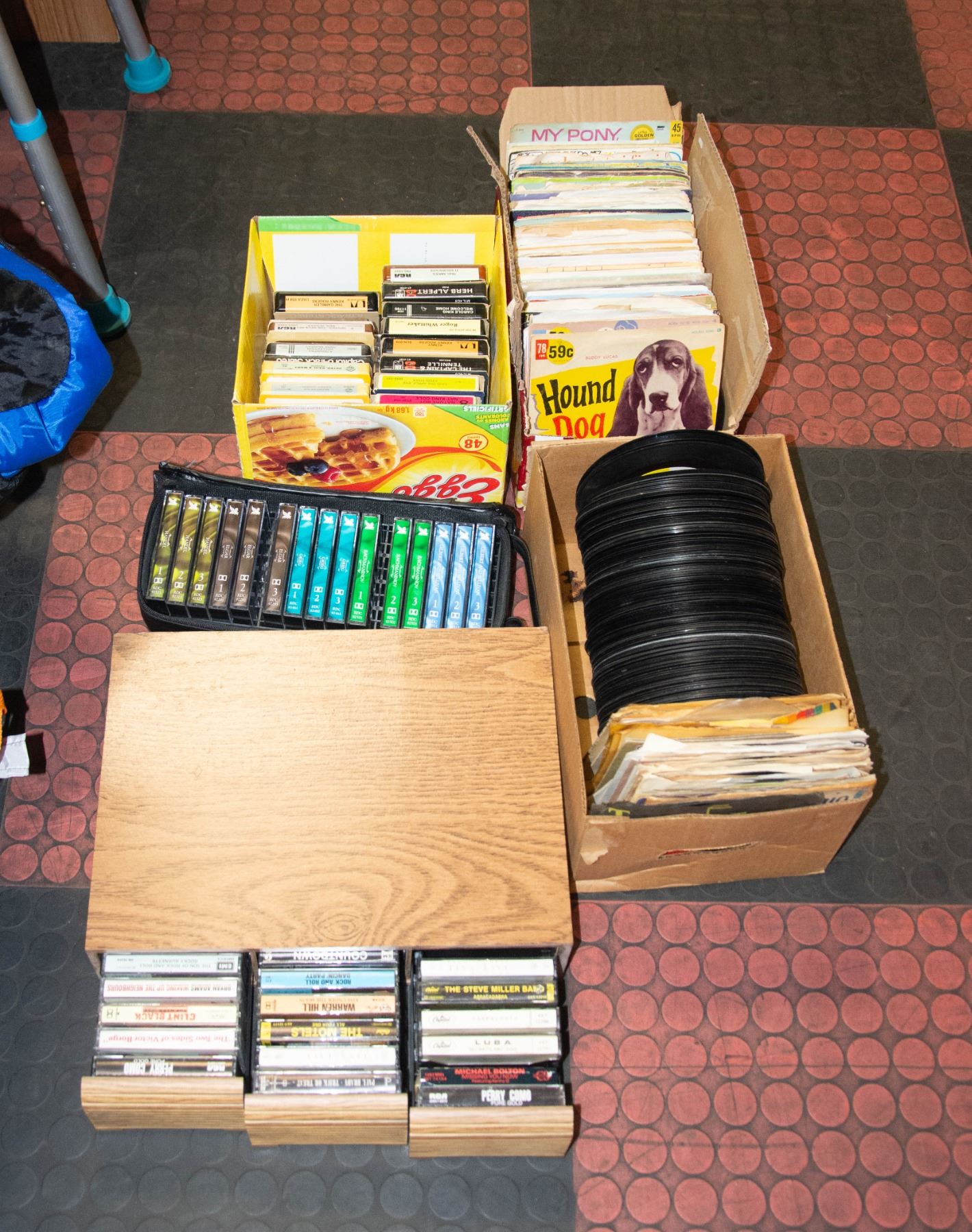 MUSIC 2 BOXES OF 45'S, CASSETTES IN CASE, 8 TRACKS