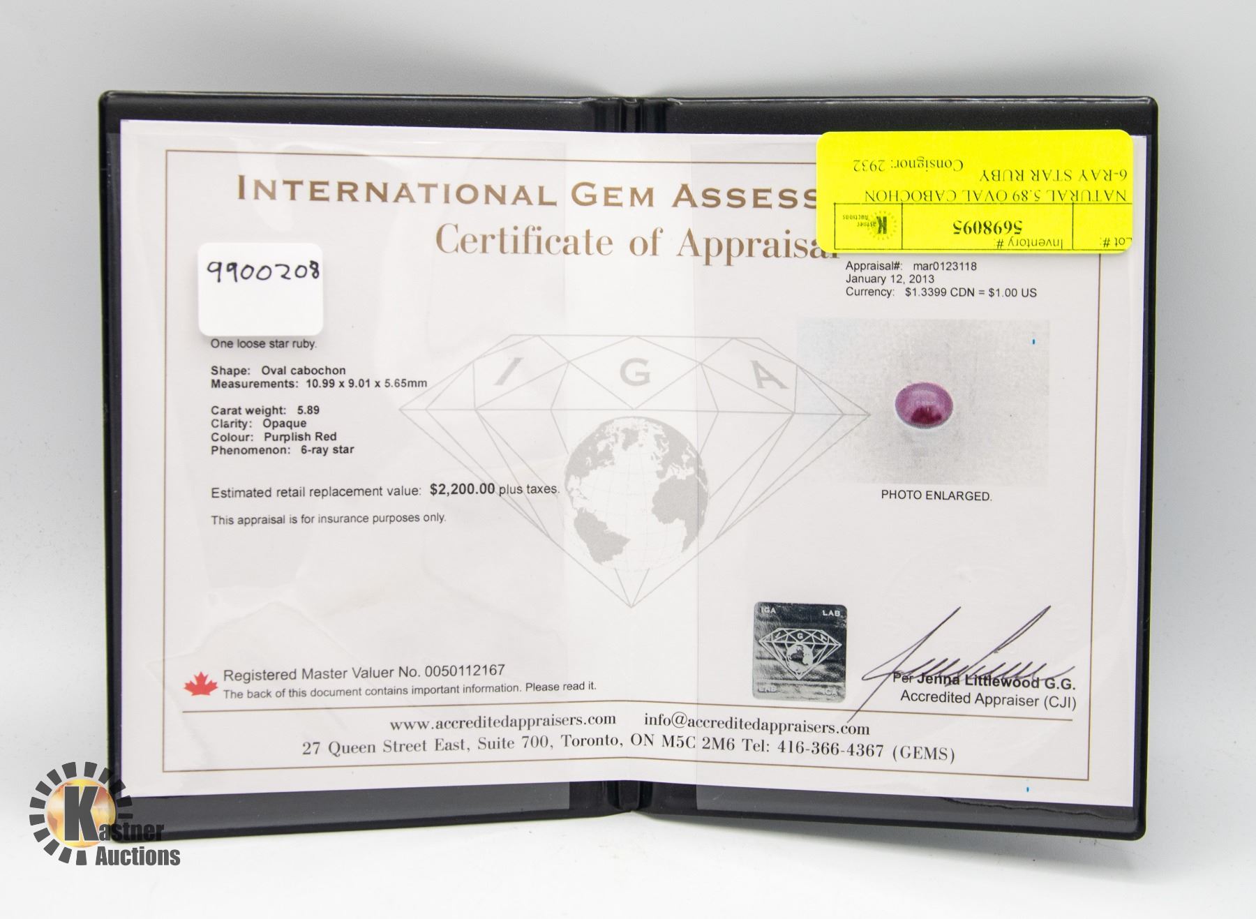 MEASURING 10.99 X 9.01 X 5.65MM, CLARITY IS OPAQUE, COLOR IS PURPLISH RED, PHENOMENON IS 6-RAY STAR. COMES WITH APPRAISAL FROM INTERNATIONAL GEM ASSESSMENT INC (MAR0123118) WITH APPRAISED VALUE $2,200.00 **ALL ITEMS MUST BE REMOVED BY 5PM SATURDAY, OCTOBER 14TH 2023. ALL REMAINING ITEMS WILL BE SUBJECT TO A $6.00 PER DAY STORAGE CHARGE. ANY ITEMS REMAINING AFTER MONDAY, OCTOBER 30TH, 2023 WILL BE CONSIDERED FORFEITED. NO REFUNDS WILL BE ISSUED FOR FORFEITED ITEMS. TO SCHEDULE A PICK UP APPOINTMENT CLICK HERE
