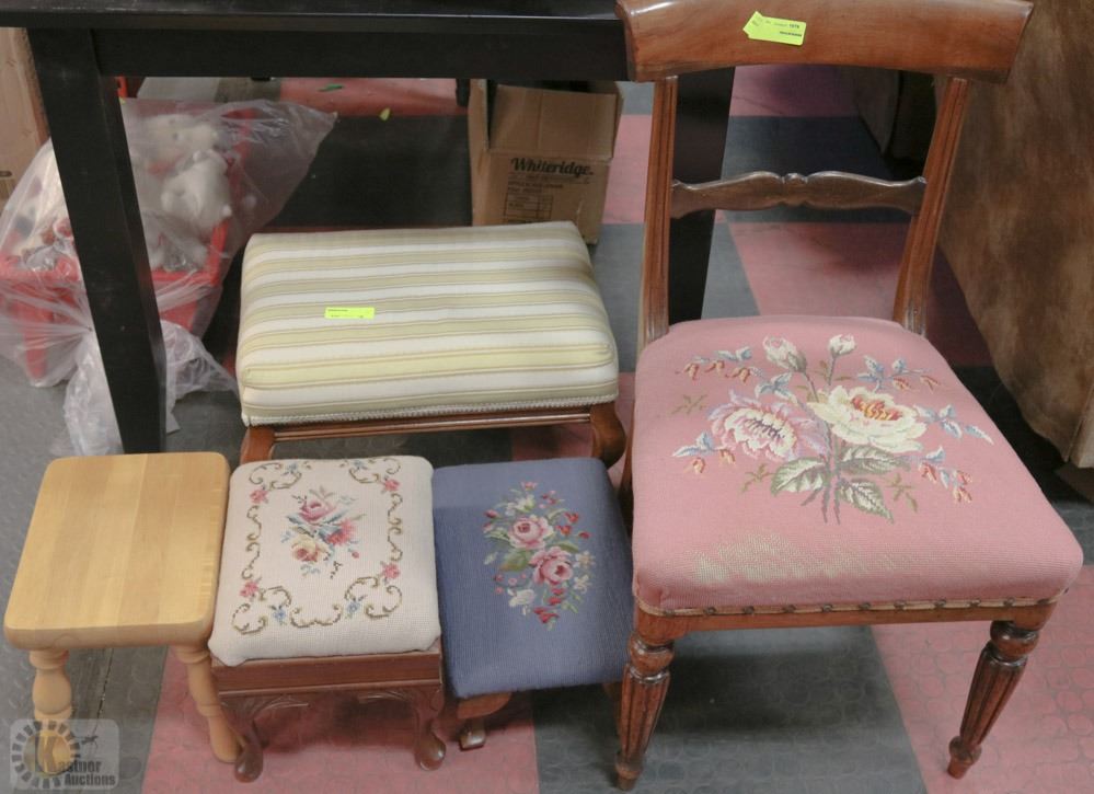NEEDLEPOINT ESTATE SIDECHAIR WITH 4 ASST. STOOLS