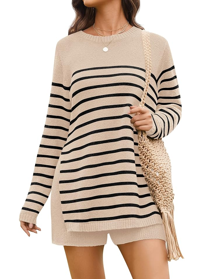 NENONA WOMEN'S STRIPE SWEATER SETS TWO PIECE KNIT OUTFITS LONG SLEEVE CASUAL TRENDY TOPS AND SHORTS LOUNGE SETS