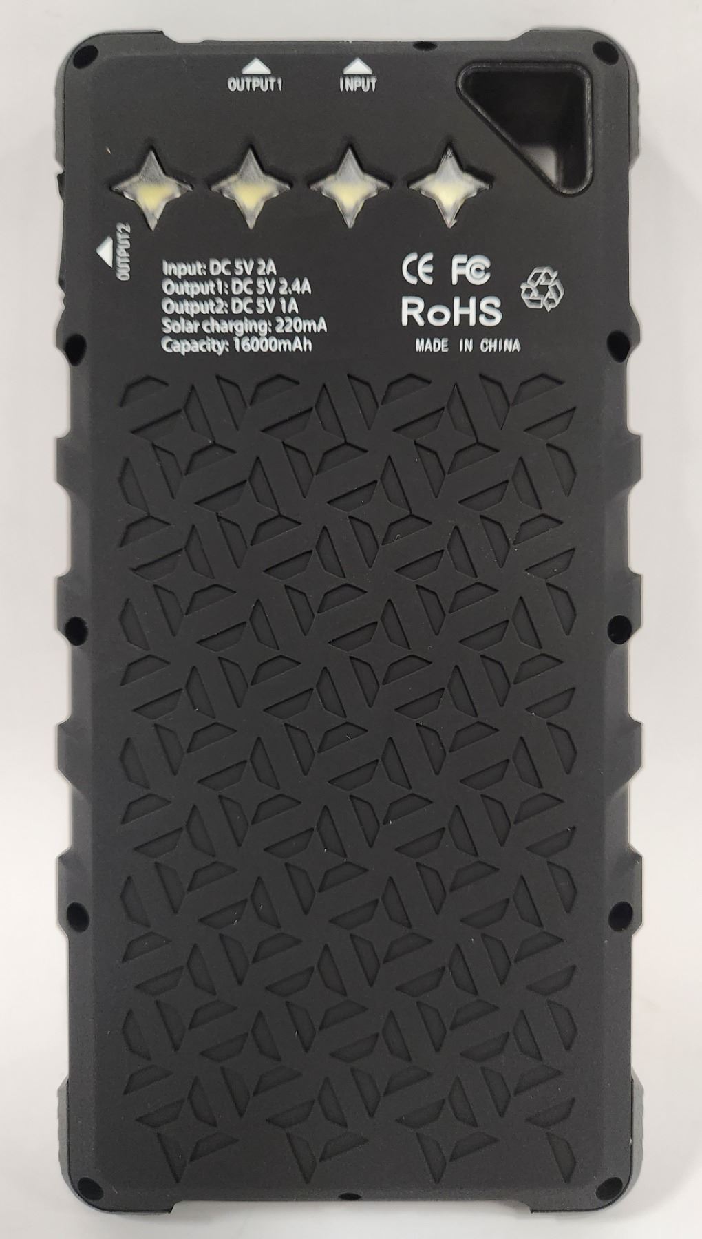 ALL WEATHER CONDITION, SOLAR POWER RECHARGEABLE BATTERY, WATERPROOF, DUSCTPROOF, SHICKPROOF RUGGED. 2 USB OUTPUTS.